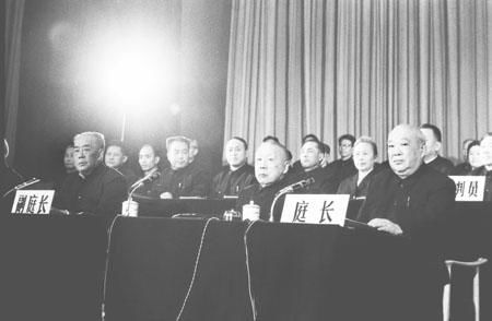 特别法庭第一审判庭开庭时的被告人江青。