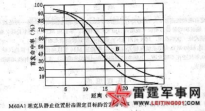 该火控系统用合像式光学测距仪测量目标距离,测量误差随距离的增大而增加,并且当能见度差时不能使用,只能依靠车长估测距离,发射1发弹来作校射修正,不容易完成快速、精确射击的任务。该火控系统未配备目标角速度传感器,因此只适合射击固定目标,其首发命中率如图所示。